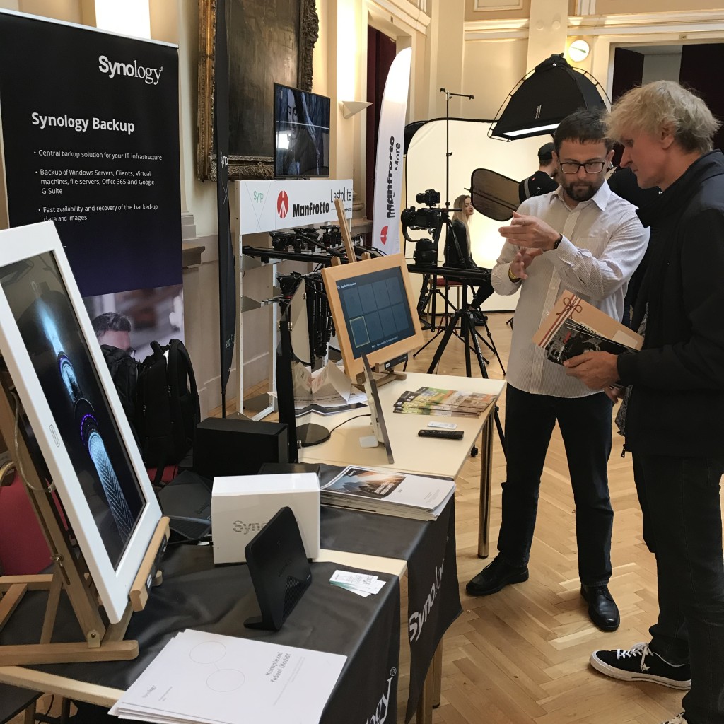 Z našich firem lze zmínit distributora Kobe s jeho digitálními fotoobrazy FrameXX a úložišti NAS od Synology (prezentoval Michal Gerbel, ředitel – na fotografii), bez jejichž úložné kapacity se dnešní foto a videotechnika neobejde, ale také dodavatelé baterií, power bank, DTP, vidět bylo i pracoviště s materiály Ilford a fototiskárnou Epson nebo pracoviště pro digitalizaci kinofilmů.